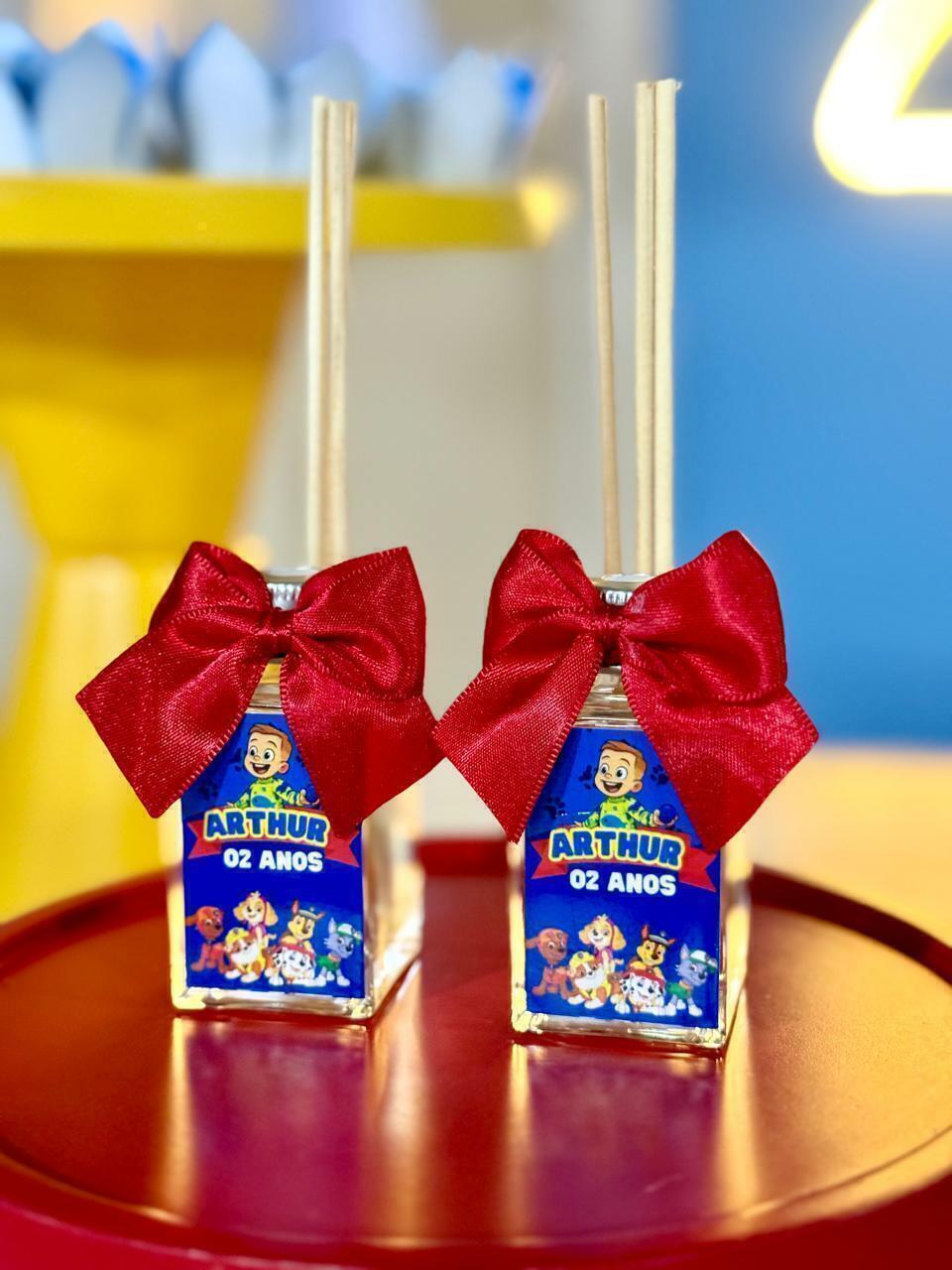 Mini Difusor 30ml em frasco de vidro com 3 varetas em bambu, adesivo personalizado, laço em cetim e fechamento em saquinho de organza. Perfeito para aromatizar pequenos ambientes e surpreender convidados como lembranças de aniversários, casamentos, batizados, chá de bebê/revelação.